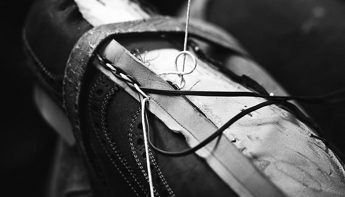 • The insole is cut from approximately 4 millimeter thick, pit-tanned leather according to the shape of the last. It is the base of the shoe, to which the frame and shaft are sewn. A welt-groove is worked into the insole using a welt-groove plane. The welt seam will run along this groove.